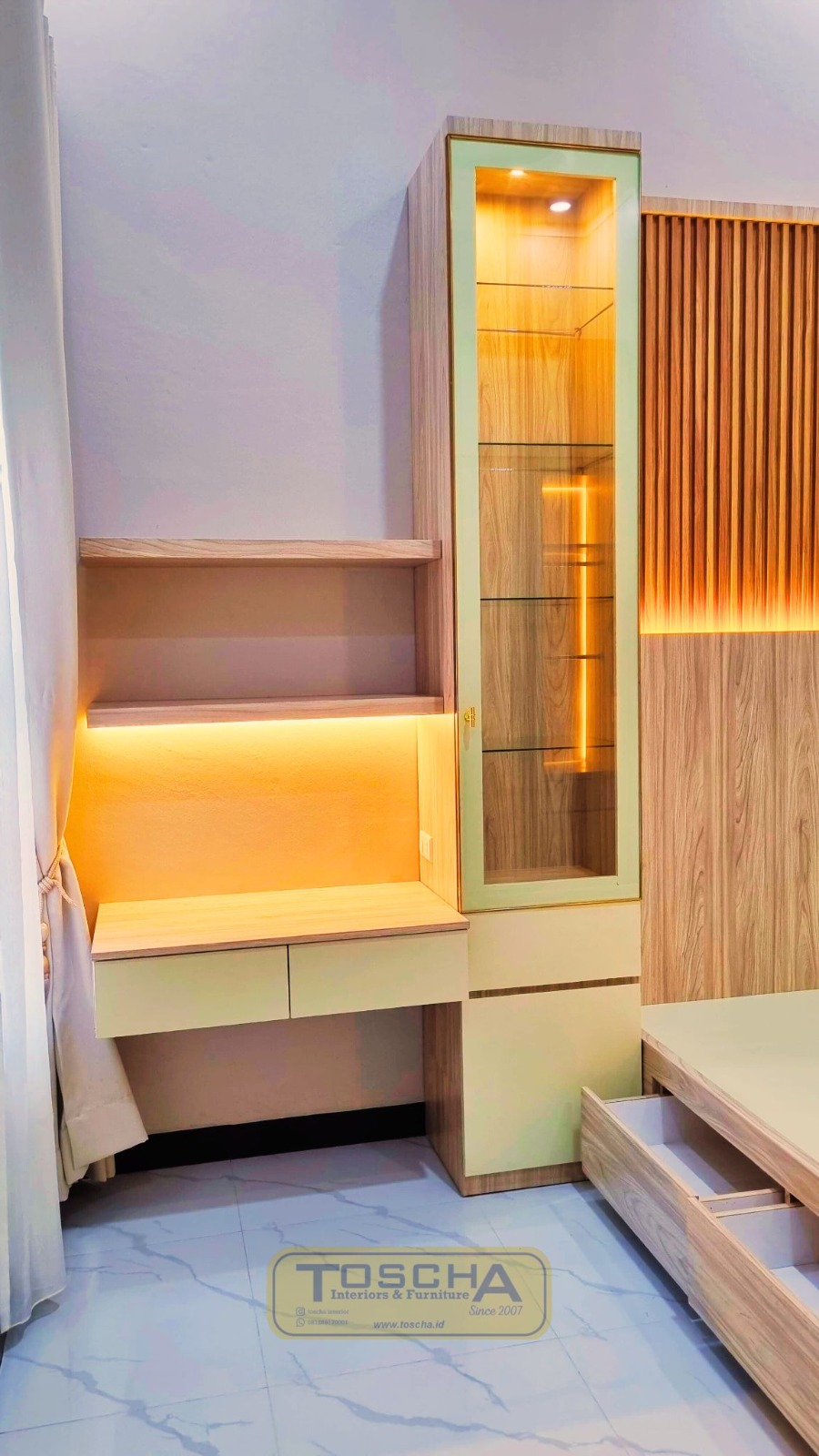 Kamar Anak Remaja yang mengakomodir beberapa kebutuhan, mulai meja belajar yang terintegrasi dengan cabinet gantung built ini dan ambalan multi fungsi.