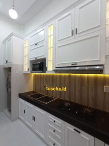 Area Yang Terbatas tidak menghalangi Keindahan dan harapan menghadirkan nuansa interior dapur yang bergaya Classic bak American Style. Seperti pada dapur hunian Bapak Nurchalis ini. Peralatan modern baik itu kompor Tanam, bak sink, Cooker Hood Oven dan Refrigerator Tertata dengan baik dalam satu sisi yang sama. Kini giliran anda.